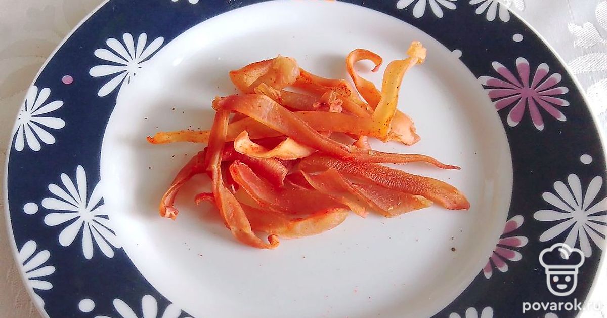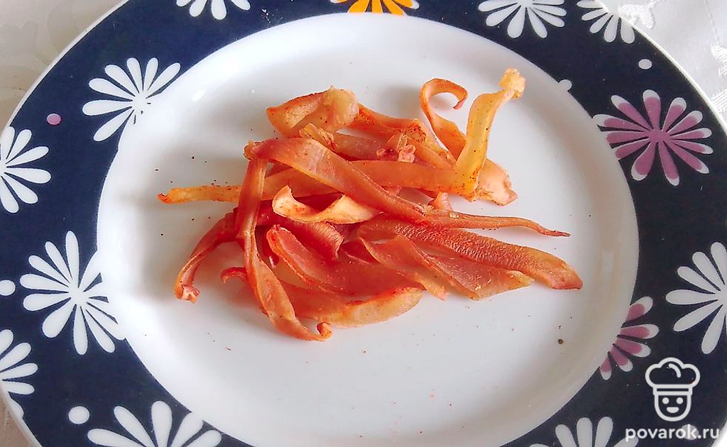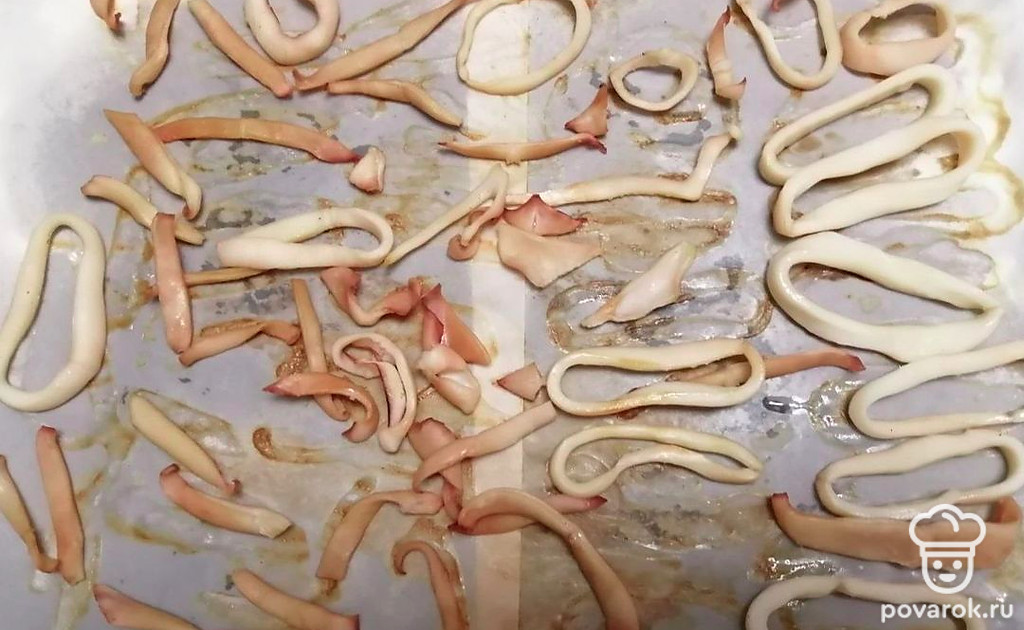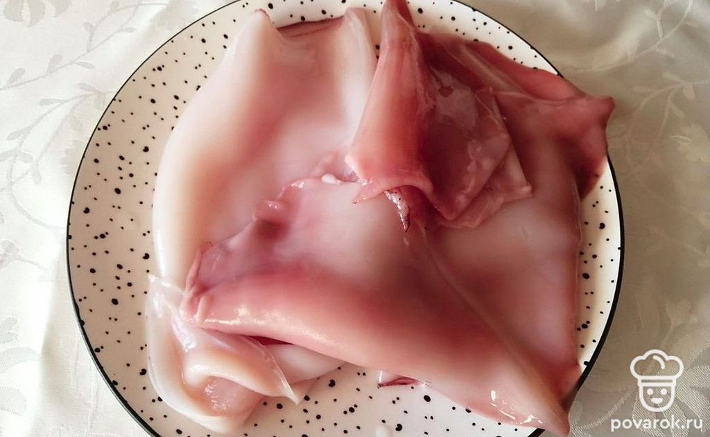 Почистите кальмаров, снимите пленку с обеих сторон.