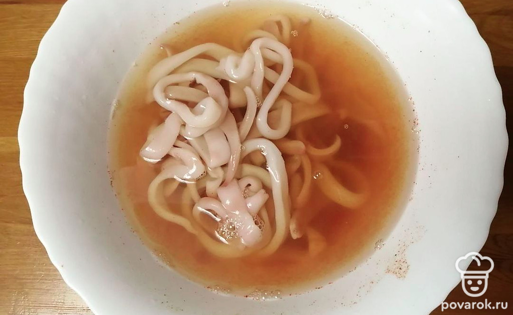 Выложите кальмаров в маринад и оставьте на 10 минут.