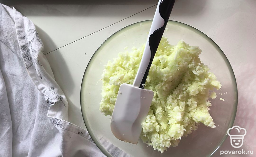 Пробейте блендером кабачок или натрите на крупной терке, посолите.