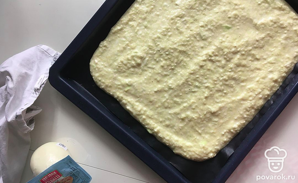 Полученную массу вылейте и распределите по противню с силиконизированным пергаментом или ковриком для выпечки.