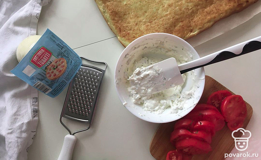 Для начинки смешайте сметану, творожный сыр и 50 граммов тертой моцареллы, свежий чеснок. Можно добавить зелень укропа или петрушки.