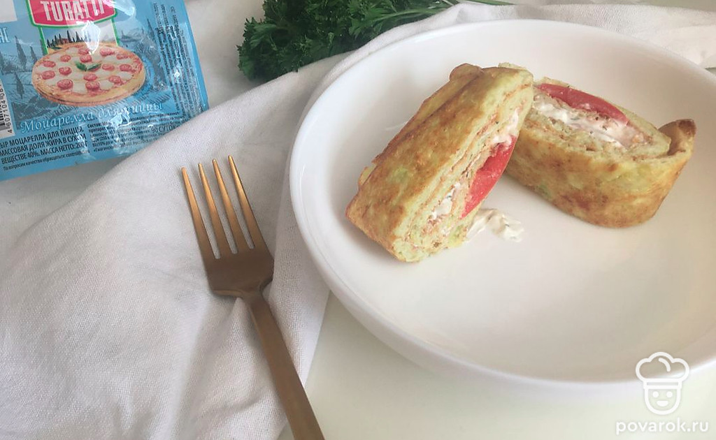Намажьте начинку на корж, выложите пластинки помидоров, посолите и сверните в рулет. Оберните пергаментом и поставьте в холодильник на 30 минут.