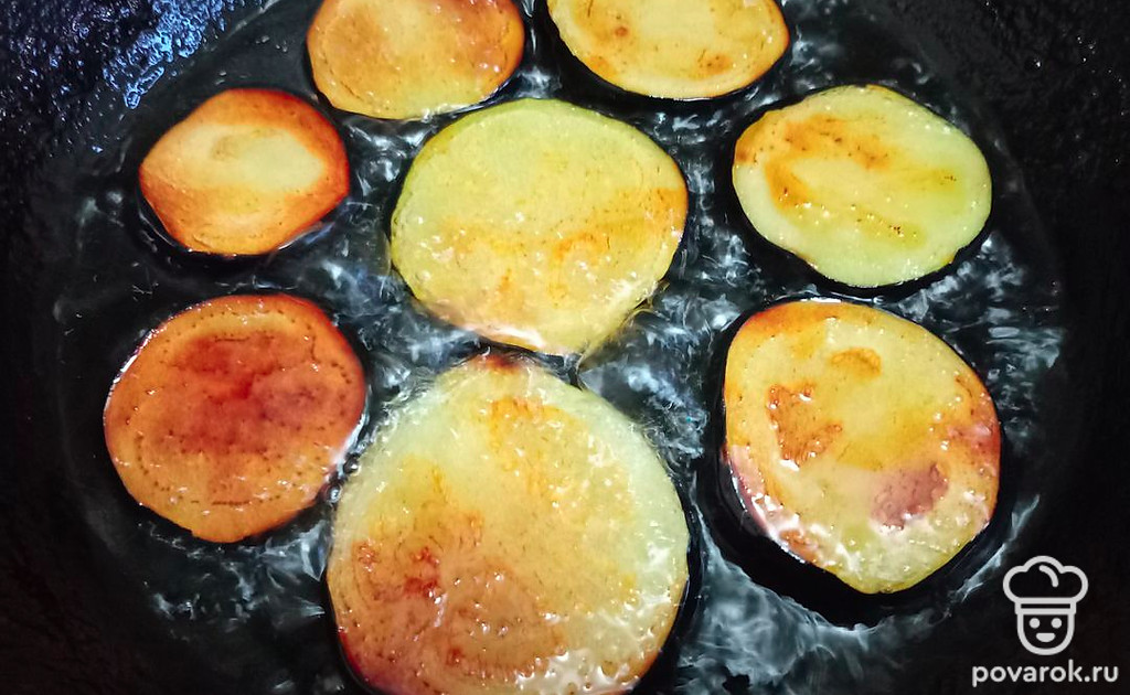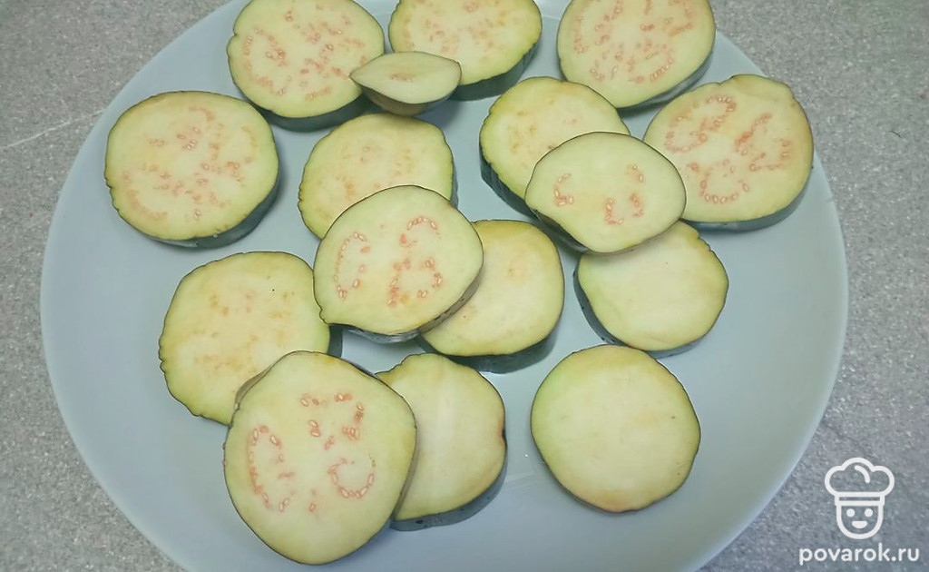 Баклажаны нарежьте кольцами толщиной 3 миллиметра.
