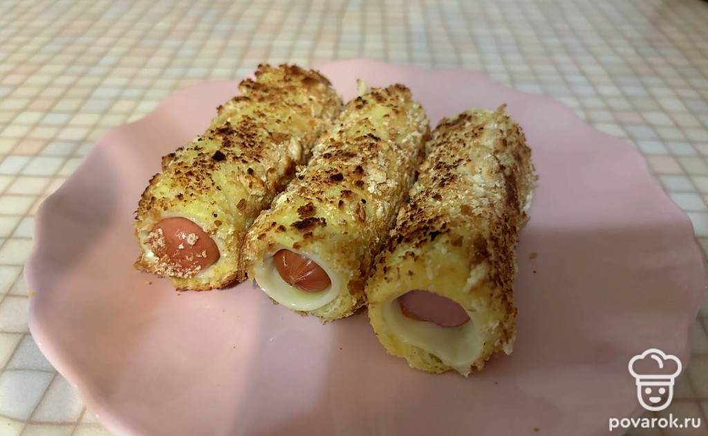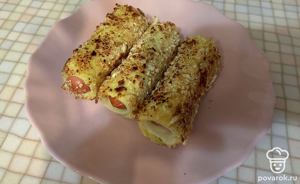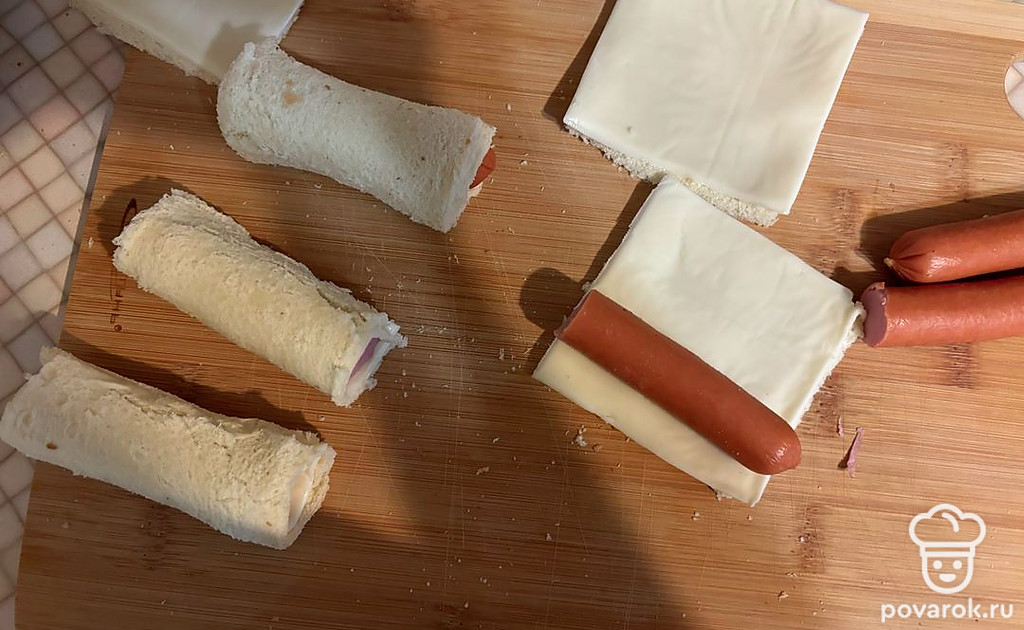 Сделайте заготовки. Заверните в хлеб сыр с сосиской.