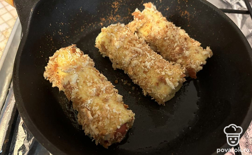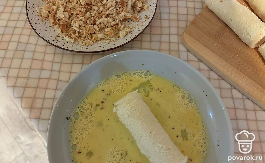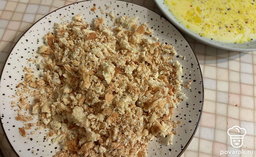 Полуфабрикаты окуните сначала в яичную смесь, а затем обваляйте их в крошке из хлеба.