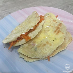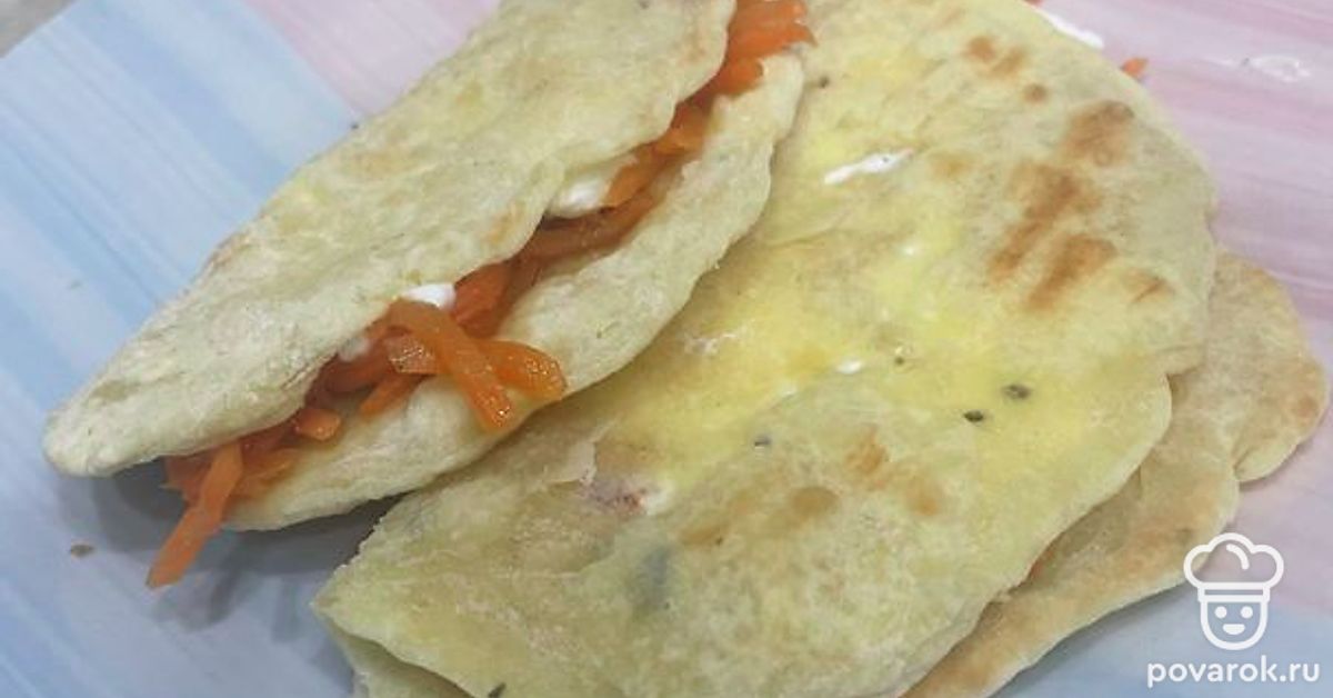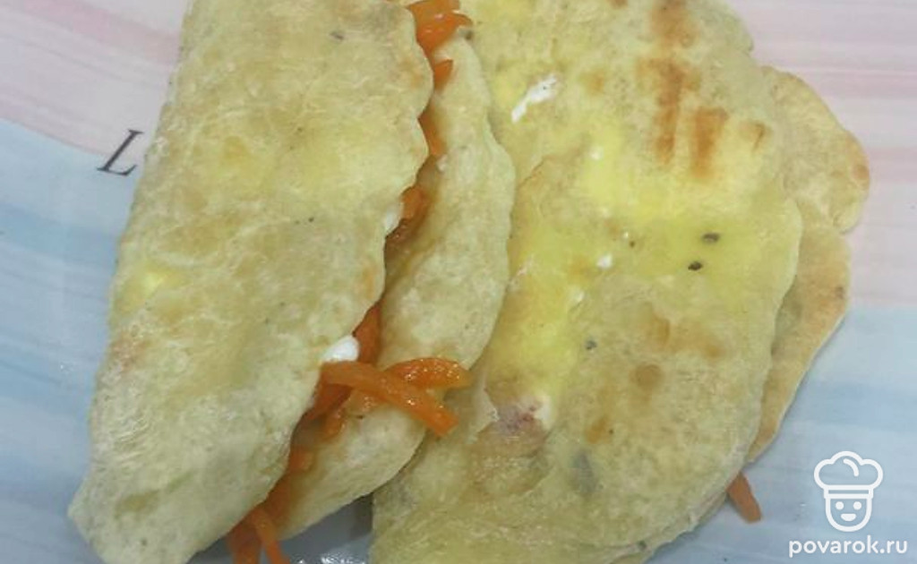 На половину лепешки положите корейскую морковь и греческий йогурт. Другой стороной закройте начинку.
