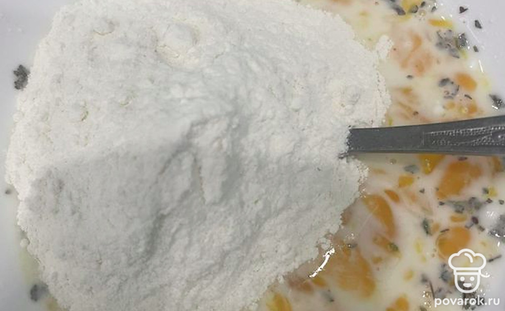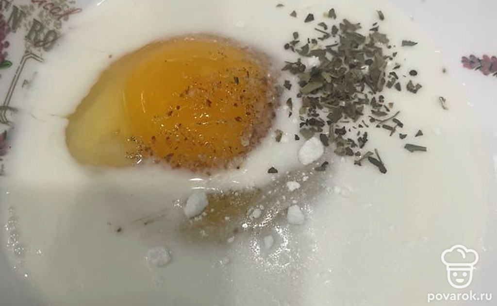 Смешайте молоко, яйцо, сушеный базилик, соль и разрыхлитель в однородную массу.