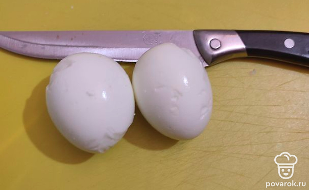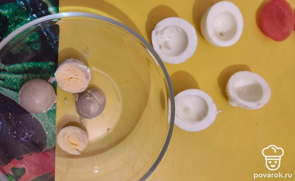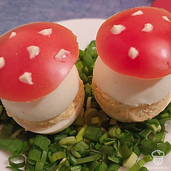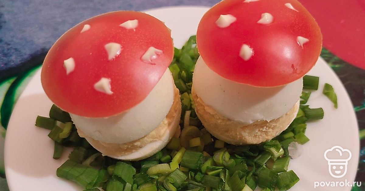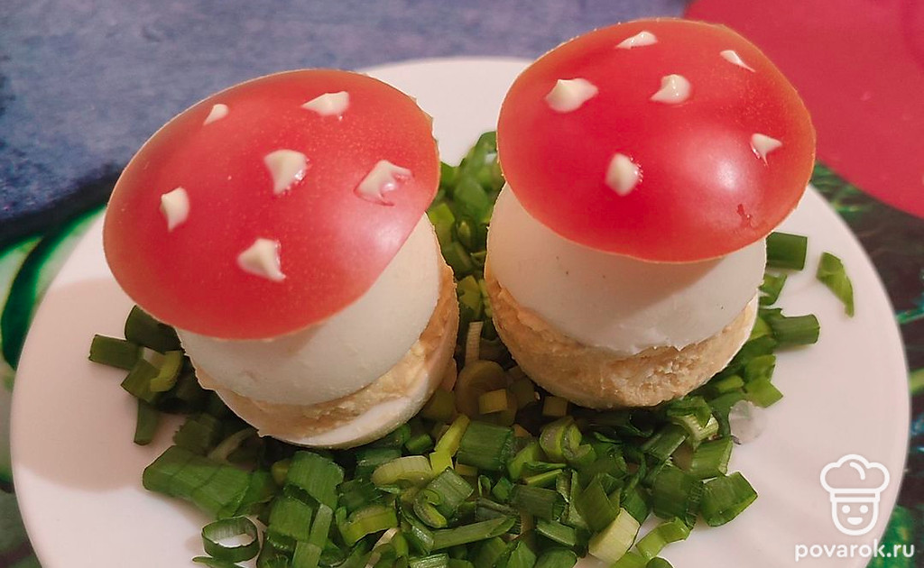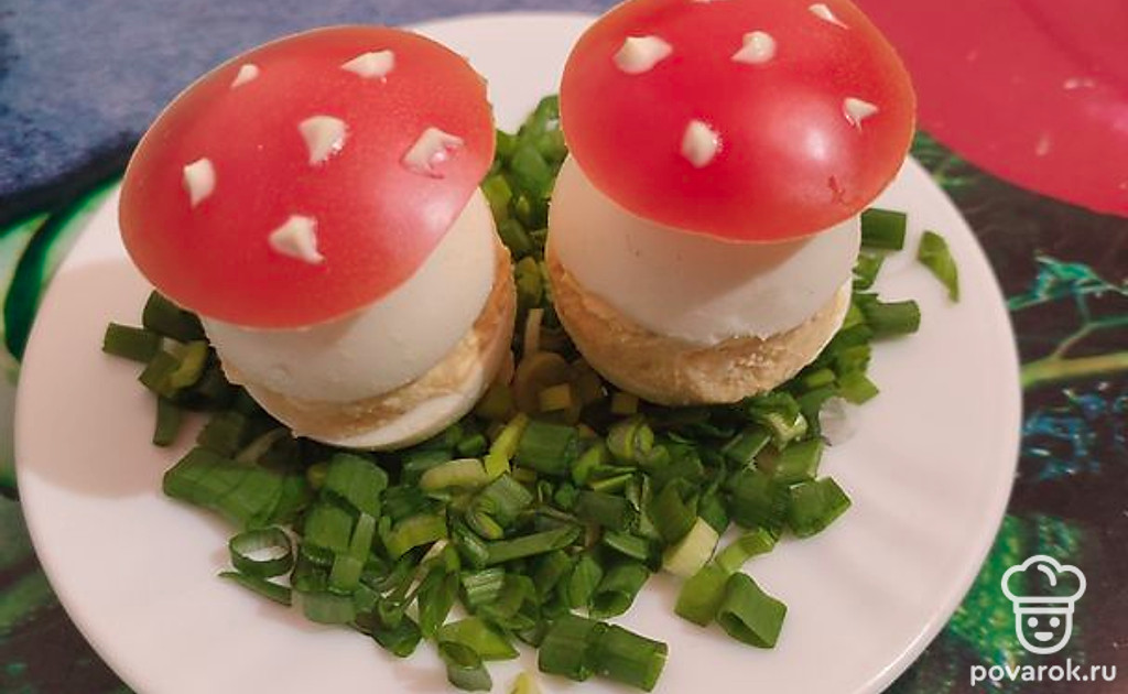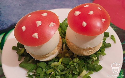 Соединить половинки так, чтобы получилось целое яйцо. Ножом срезать дно яйца, чтобы можно было его поставить. Срезать верхушку яйца, чтобы разместить шляпки из помидора. Зеленый лук нарезать колечками и выложить на тарелку. Яйца поставить на эту подушку из лука.