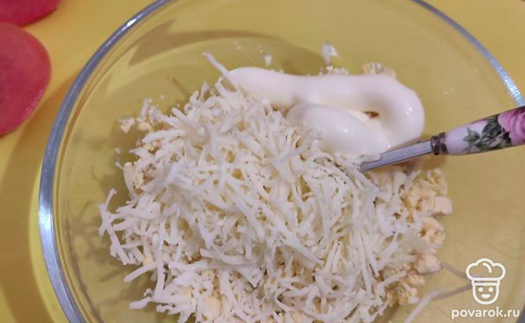 Желтки растереть вилкой в мелкую крошку, смешать с тертым сыром, чесноком и майонезом.