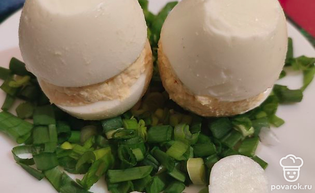 Подавать яйца на тарелке, усыпанной зеленым луком. Шляпки можно украсить точечками майонеза.