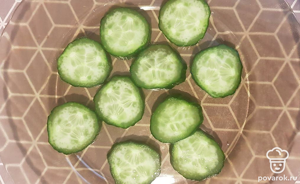 Огурец помойте и нарежьте кружочками. Выложите на тарелку.