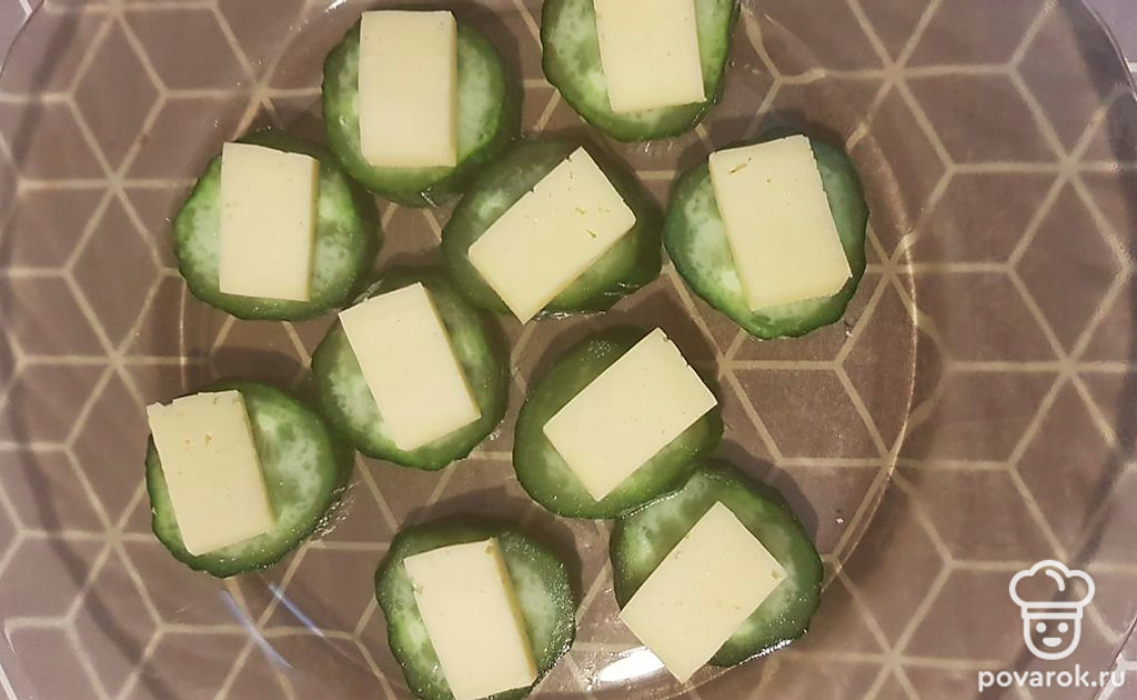 Сыр нарежьте на небольшие ломтики и выложите поверх огурцов.