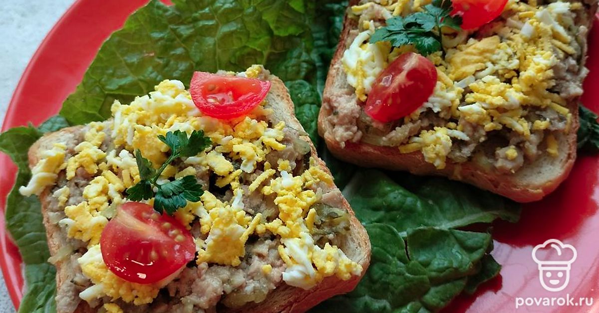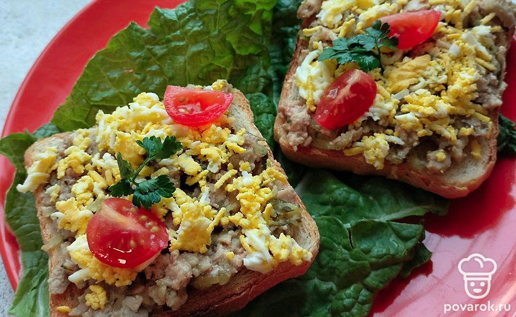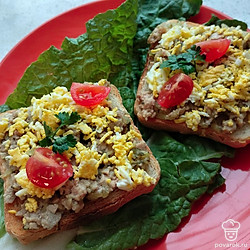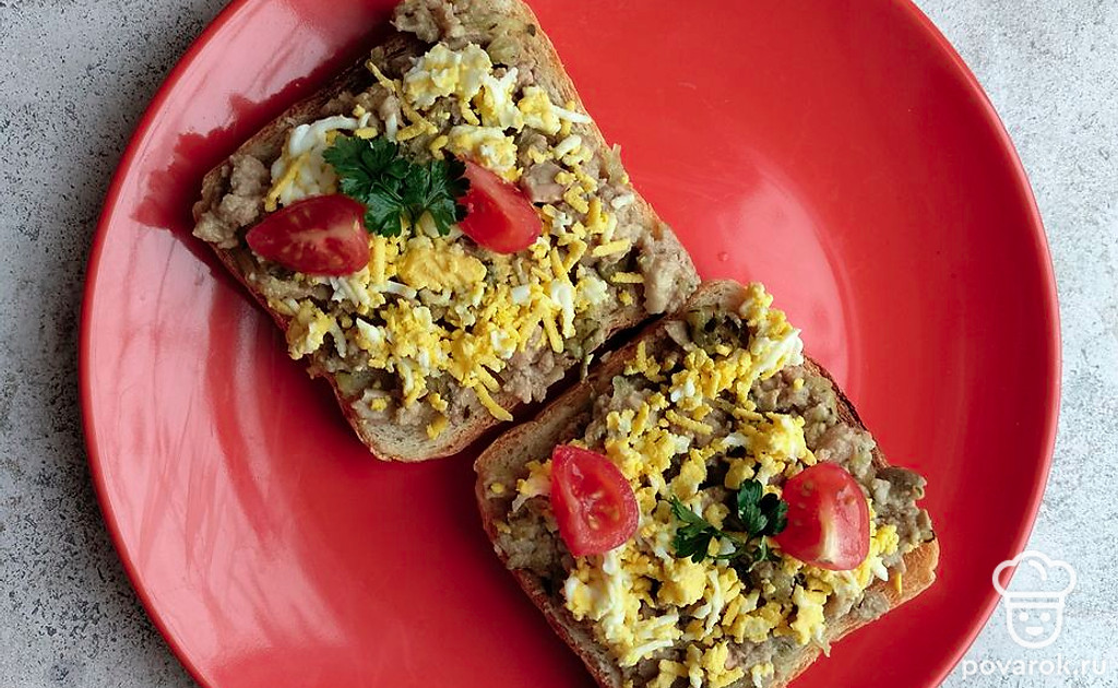 Выкладываем смесь на хрустящий тостер. Украшаем остатками яйца, зеленью и нарезанным помидором черри. Бутерброд готов. Приятного аппетита.