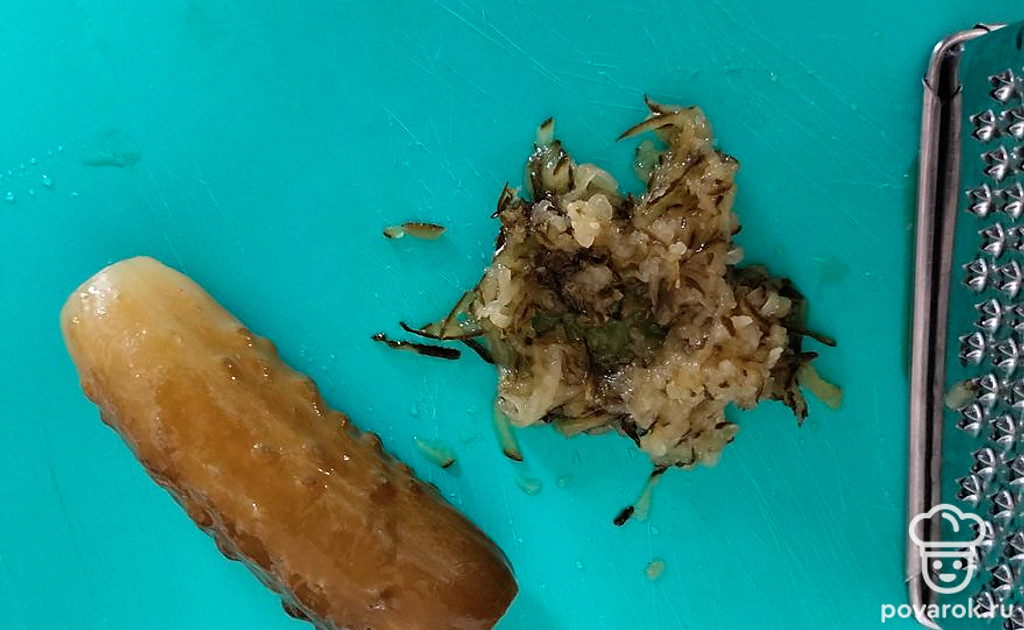 Натираем на терке соленый огурец. Добавляем его к печени трески.