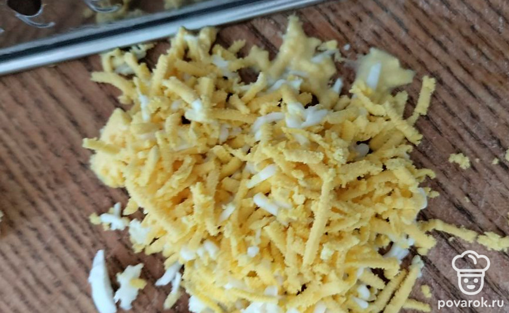 Натираем вареное куриное яйцо. Одну часть добавляем в тарелку, а вторую часть оставляем для украшения.