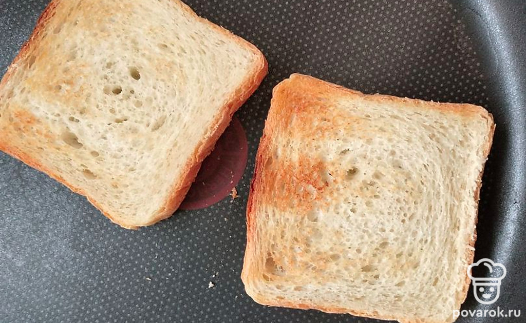 Обжариваем хлеб на сухой сковороде с двух сторон по несколько минут (до появления золотистой корочки). Можно воспользоваться тостером, если он у вас есть.