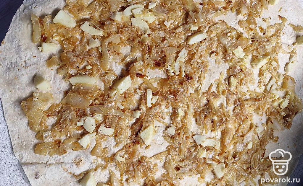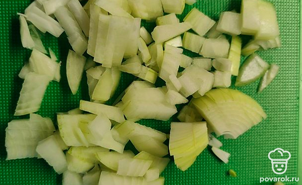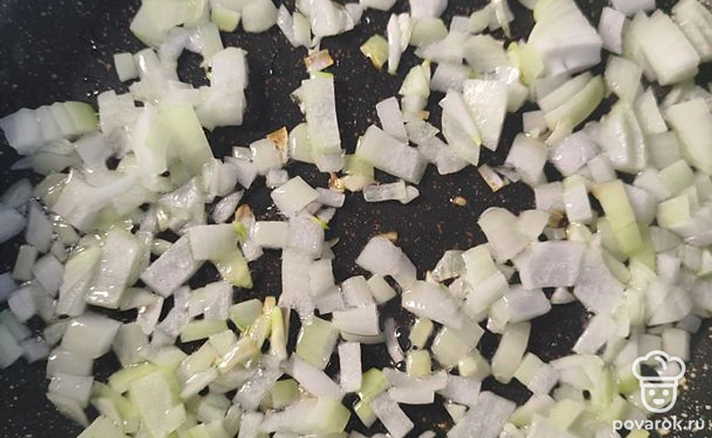 Сковороду, смазанную маслом, разогрейте. Выложите лук. Жарьте, пока лук не станет прозрачным.