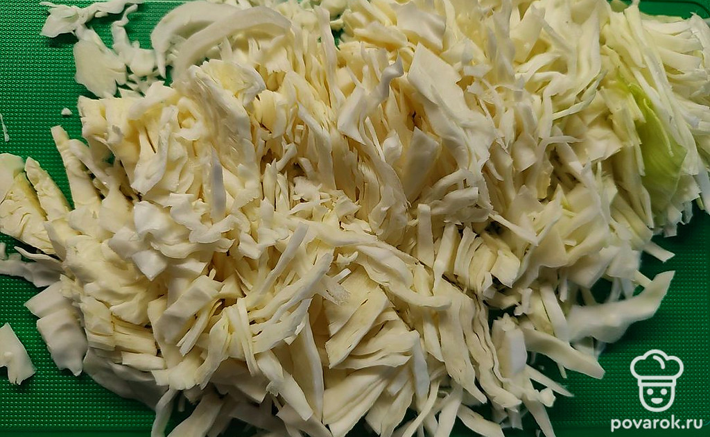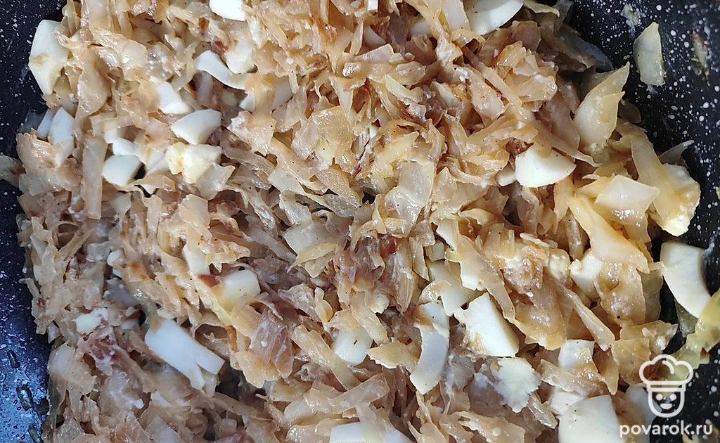 Добавьте капусту и обжарьте, помешивая, 10 минут. Добавьте 50 миллилитров воды, соль и перец по вкусу. Убавьте огонь, накройте крышкой и тушите 20 минут, помешивая.