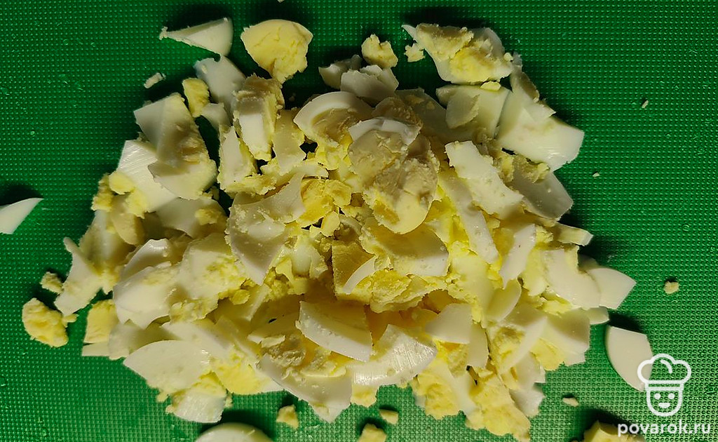 Три яйца отварите вкрутую. Почистите и нарежьте кубиком.