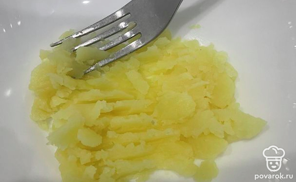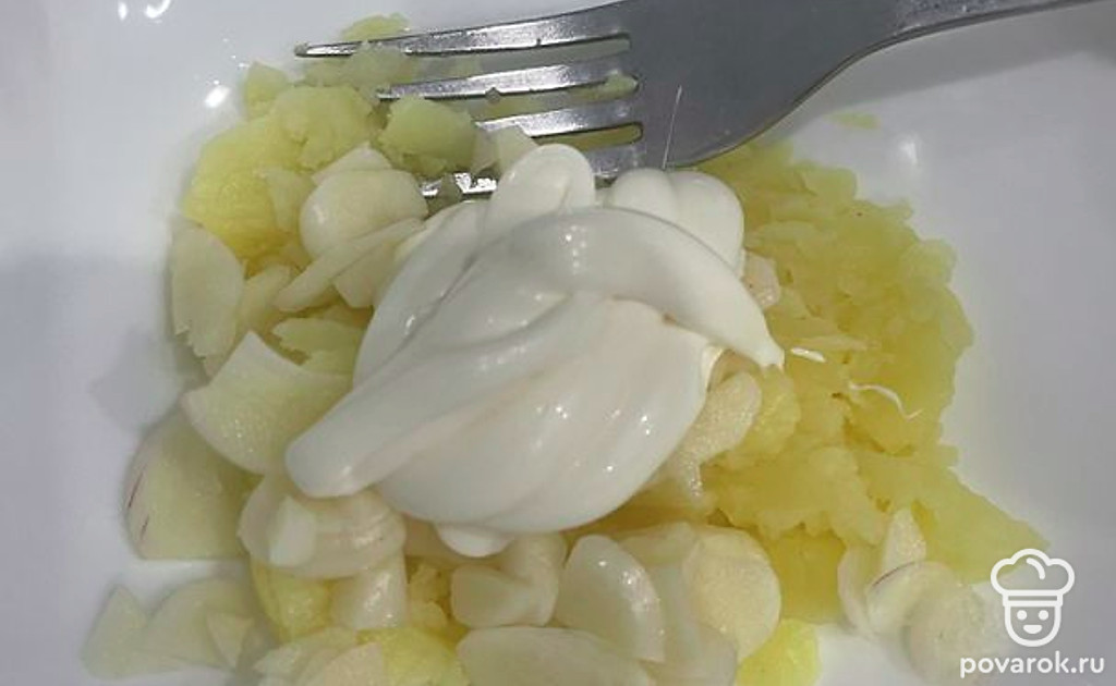 Добавьте чеснок к картошке и заправьте майонезом. Перемешайте.