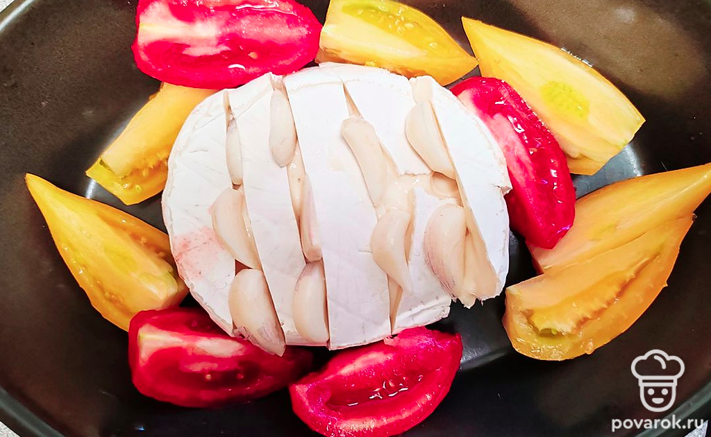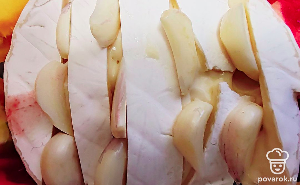 Возьмите головку камамбера, сделайте продольные разрезы, вставьте в них зубчики чеснока.