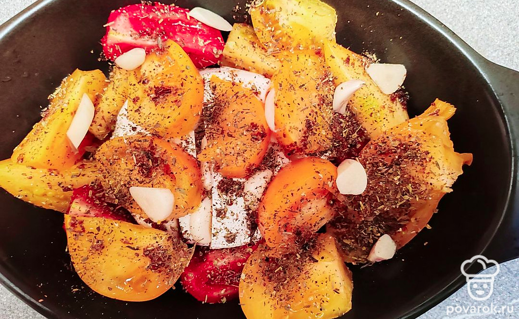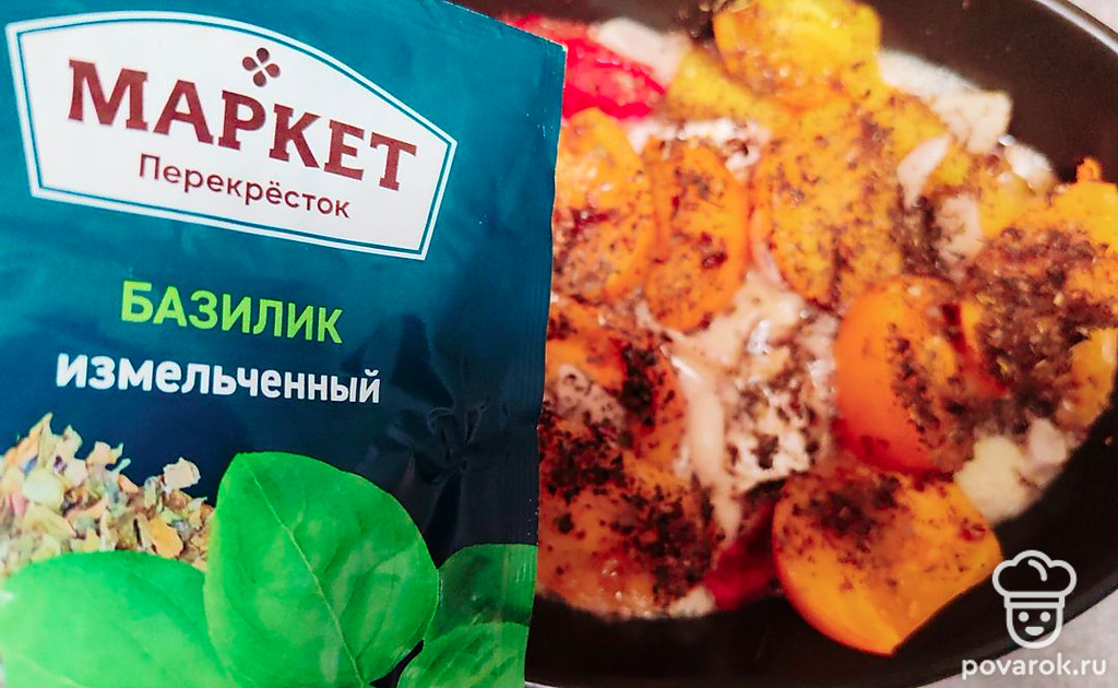 Обильно посыпьте сушеным базиликом и полейте чесночным маслом. Выложите чеснок.