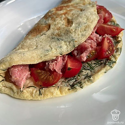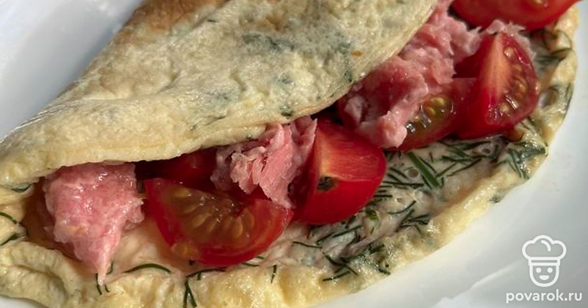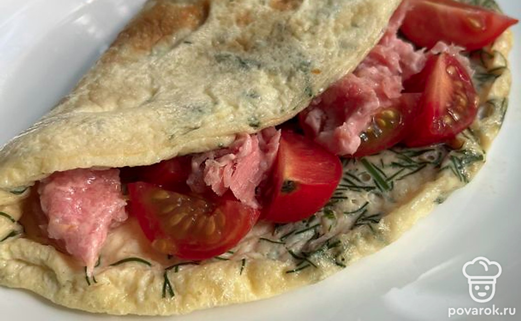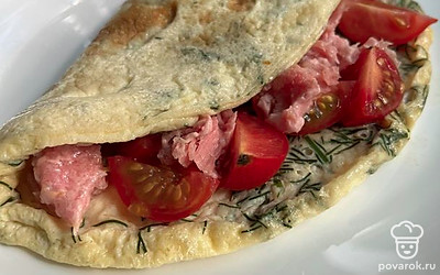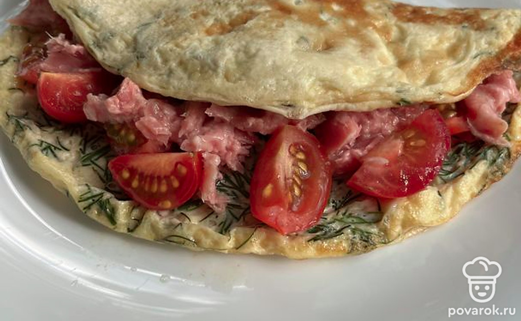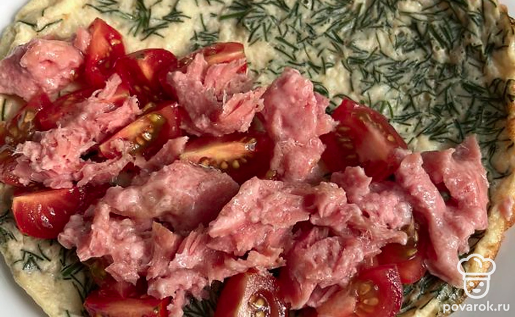 Нарежьте помидоры черри, тунец достаньте из банки и разделите на небольшие кусочки. Выложите фриттату на тарелку и начините ее помидорами черри и тунцом. Накройте второй половиной.