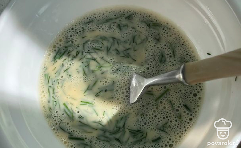 Помойте пучок укропа и нарежьте. Смешайте укроп с яйцами.