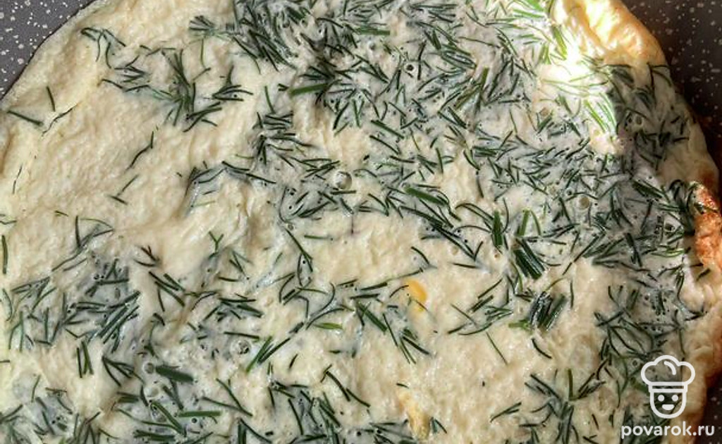 Раскалите антипригарную сковороду. Кисточкой нанесите несколько капель растительного масла. Вылейте яичную смесь и жарьте на небольшом огне под крышкой.
