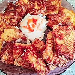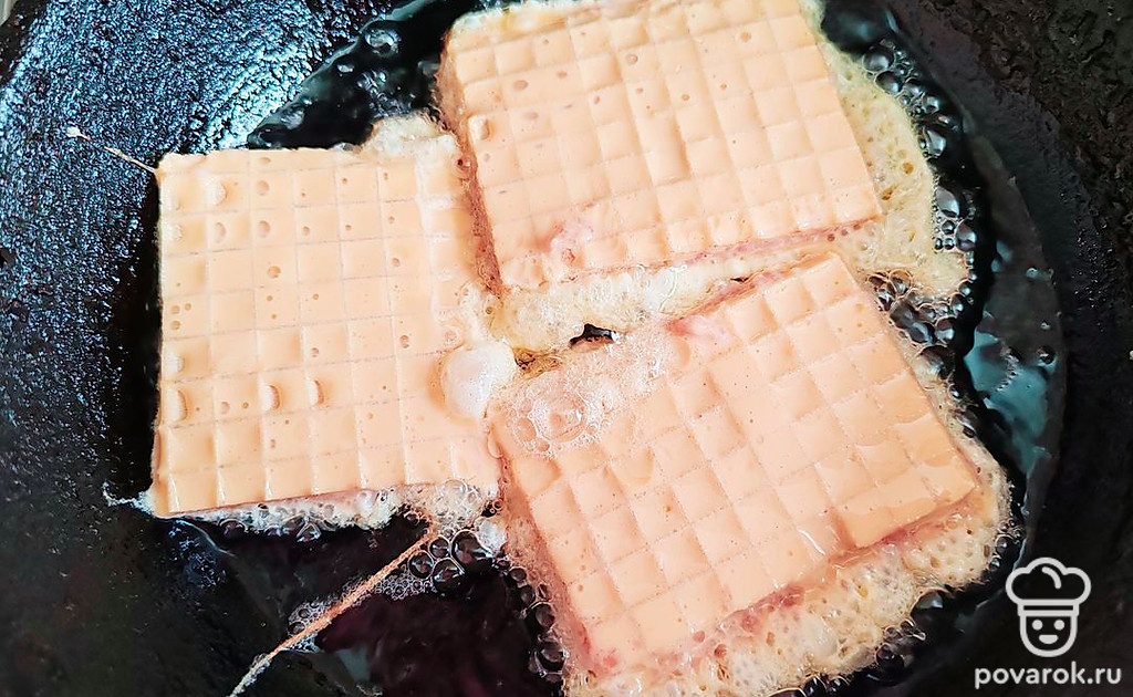 Каждый ландорик окунайте в яично-майонезную смесь. Жарьте на растительном масле до красивого румяного цвета, на среднем огне, по 2-3 минуты с каждой стороны.