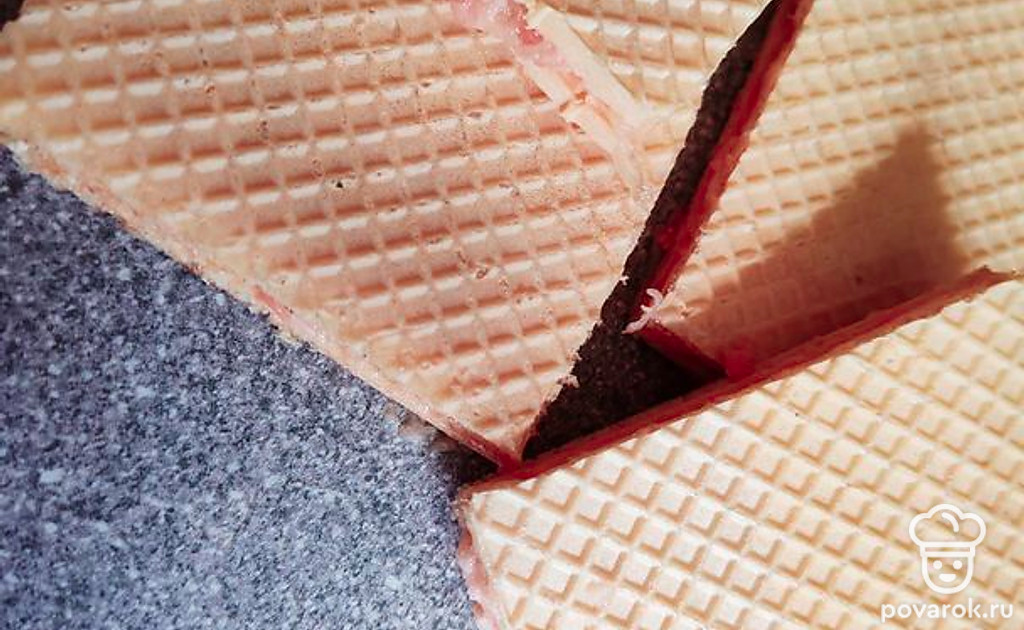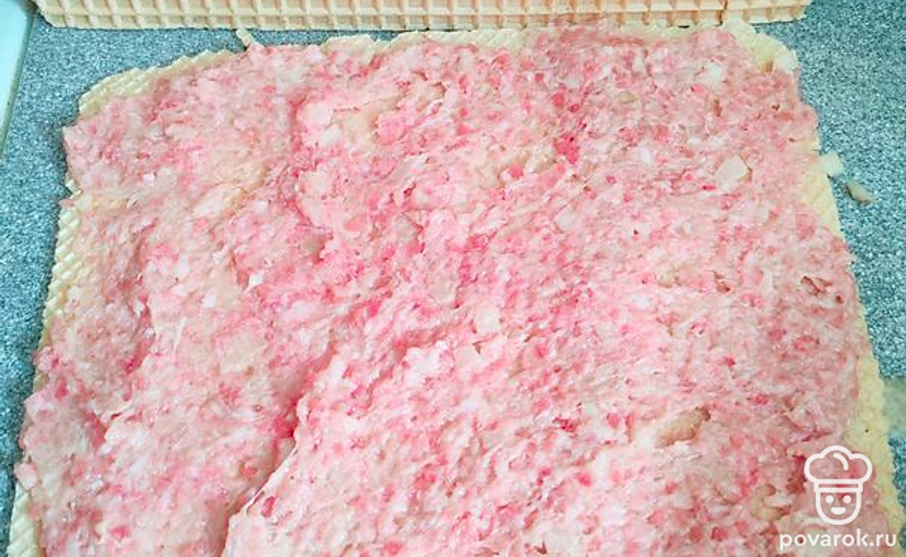 На несладких вафлях равномерно распределите фарш, не очень толсто, примерно по 3-5 миллиметров. Накройте вторым листом.