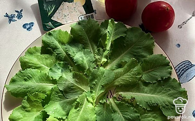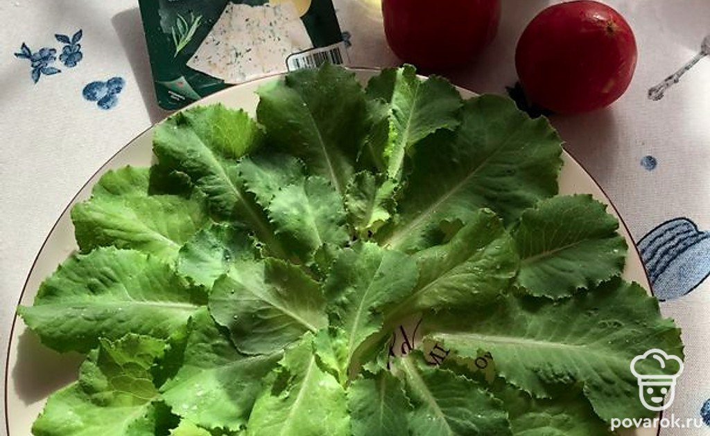 Листья салата промыть, просушить, выложить на блюдо.