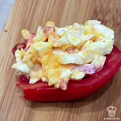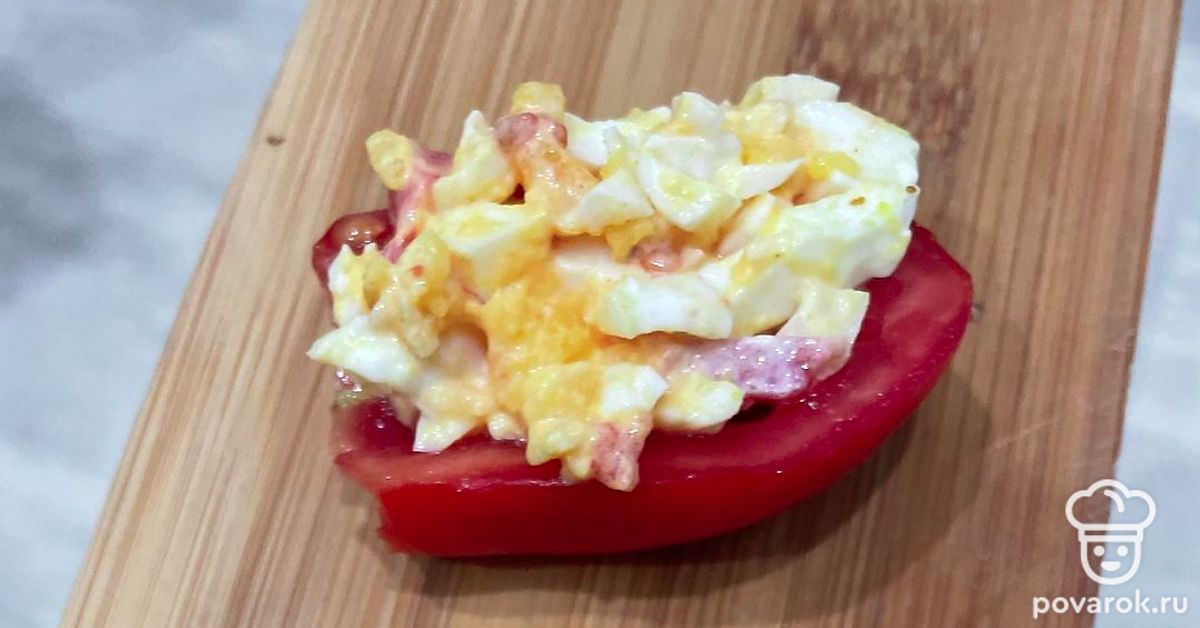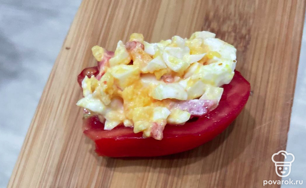 Заполните начинкой половинки помидоров.