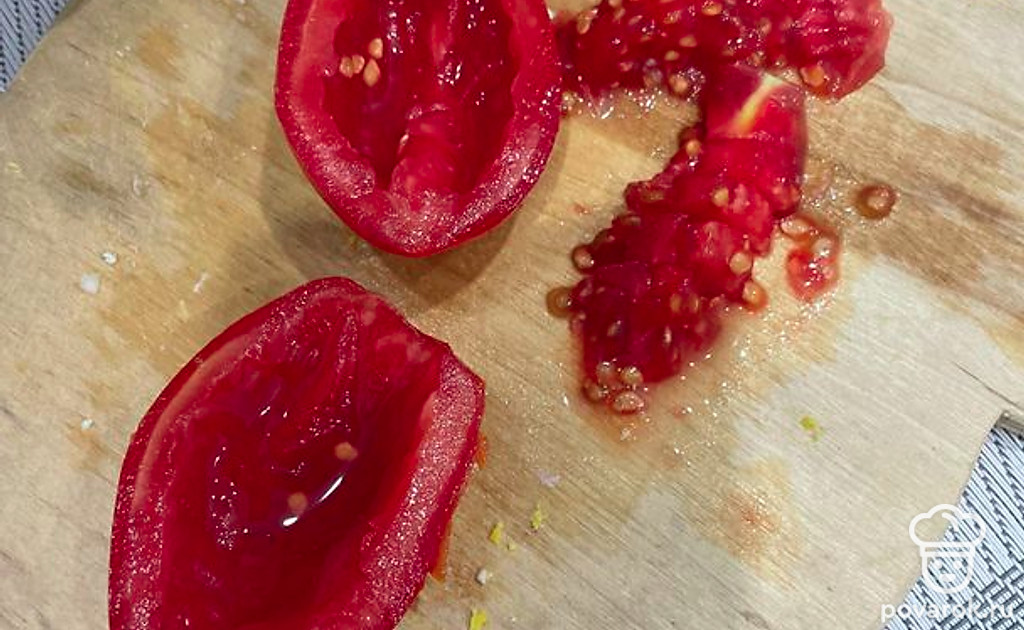 Сливовидный помидор разрежьте пополам. Сердцевину вырежьте и мелко покрошите.