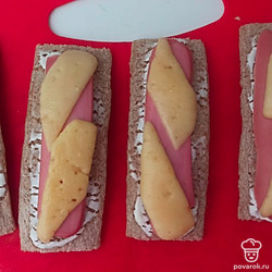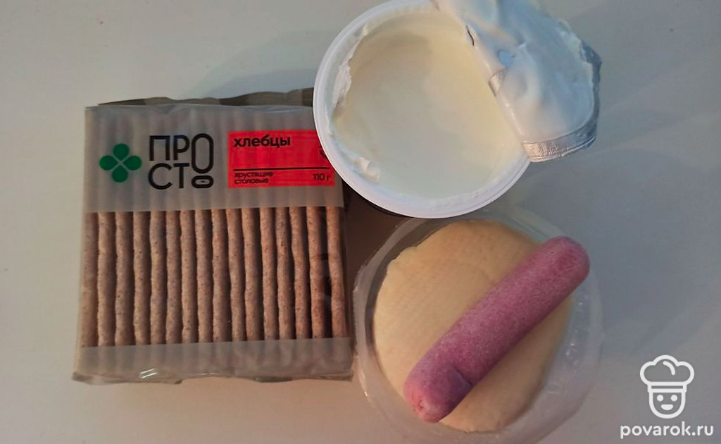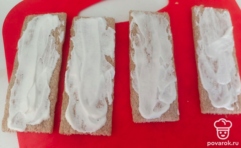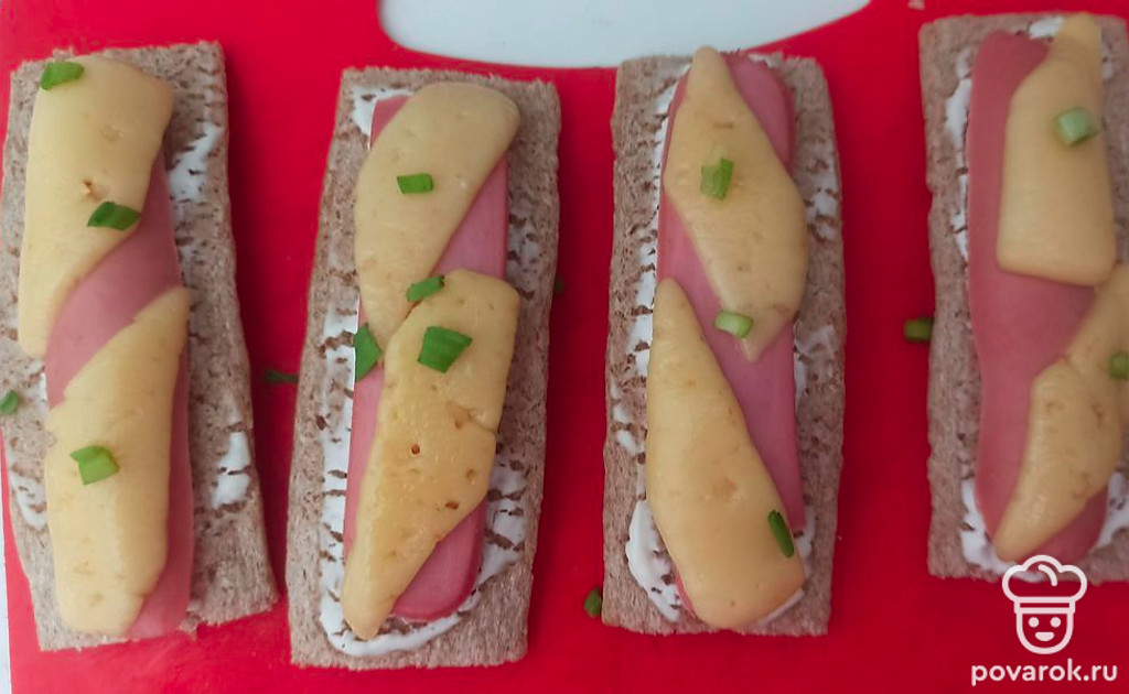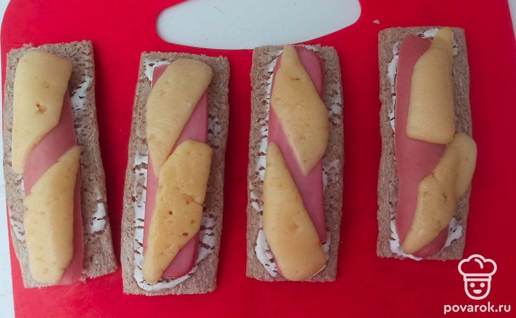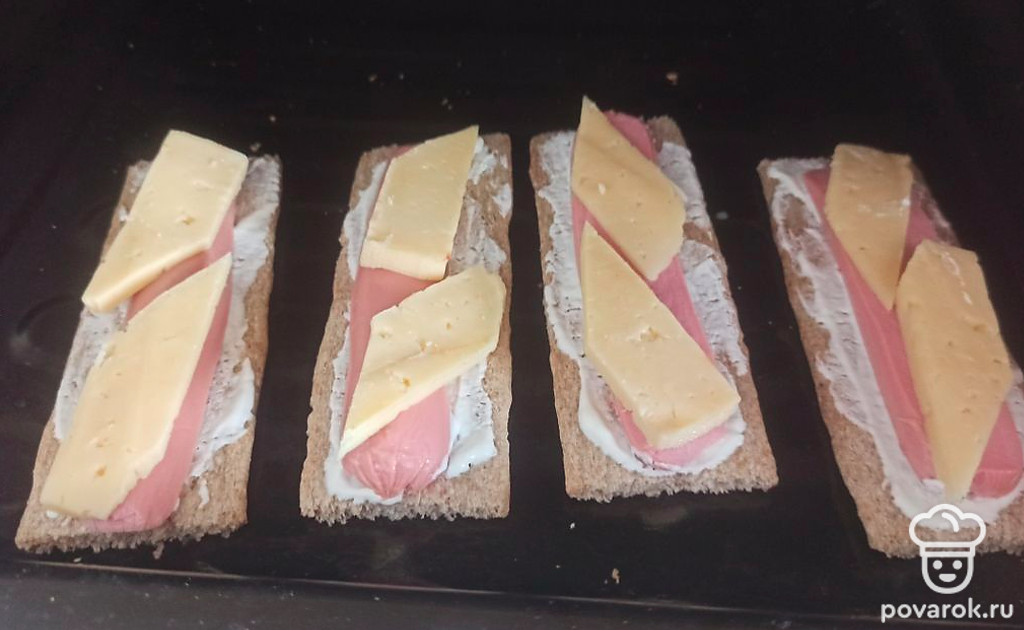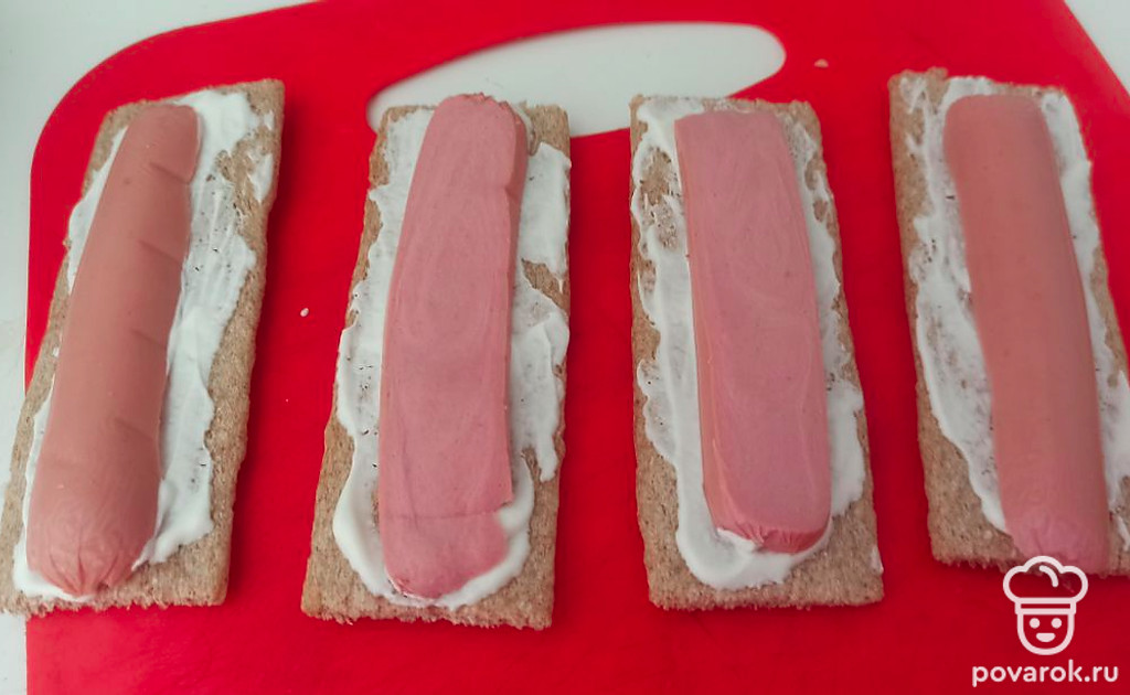 Нарезаем вдоль сосиски и выкладываем на хлебцы.