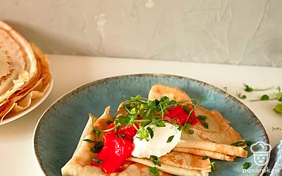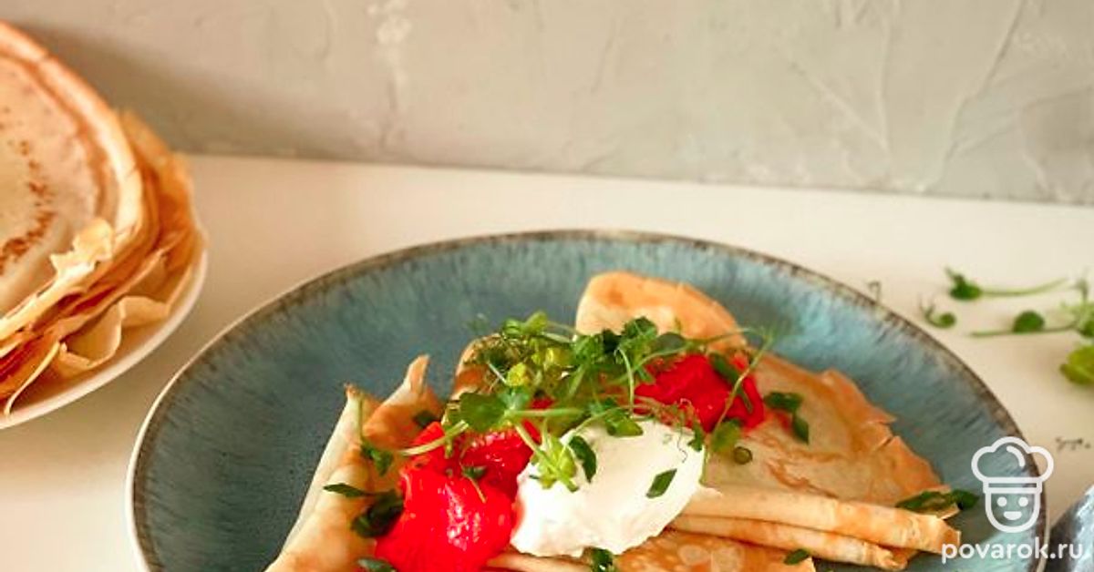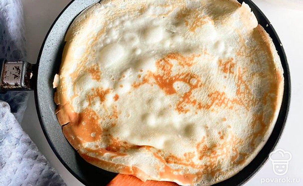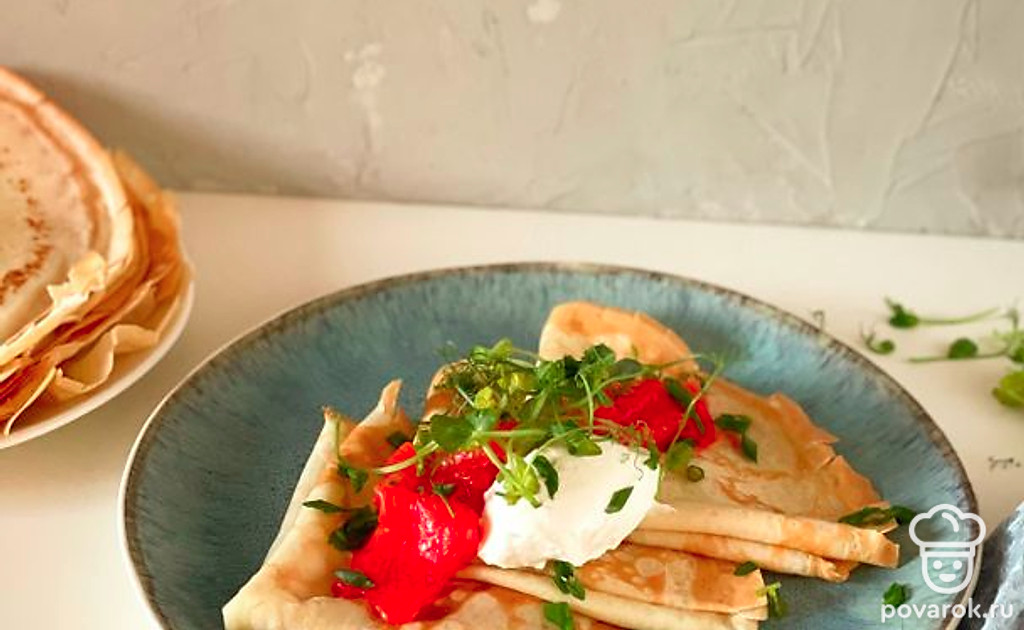 Готовые блинчики можно есть самостоятельно или с вашими любимыми начинками: мед, варенье, сметана, ягоды, красная рыба, икра и т.д.