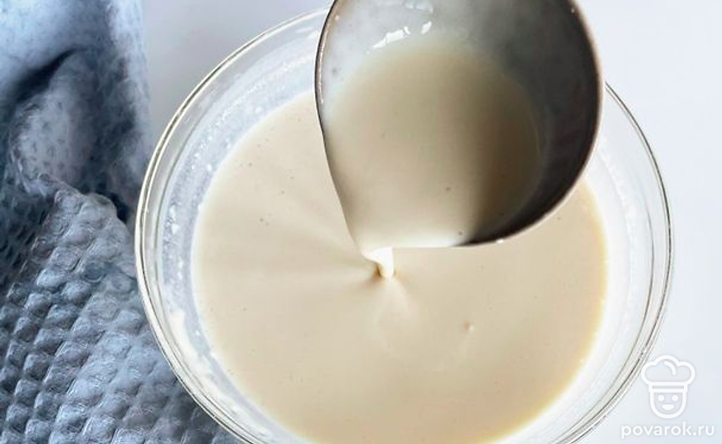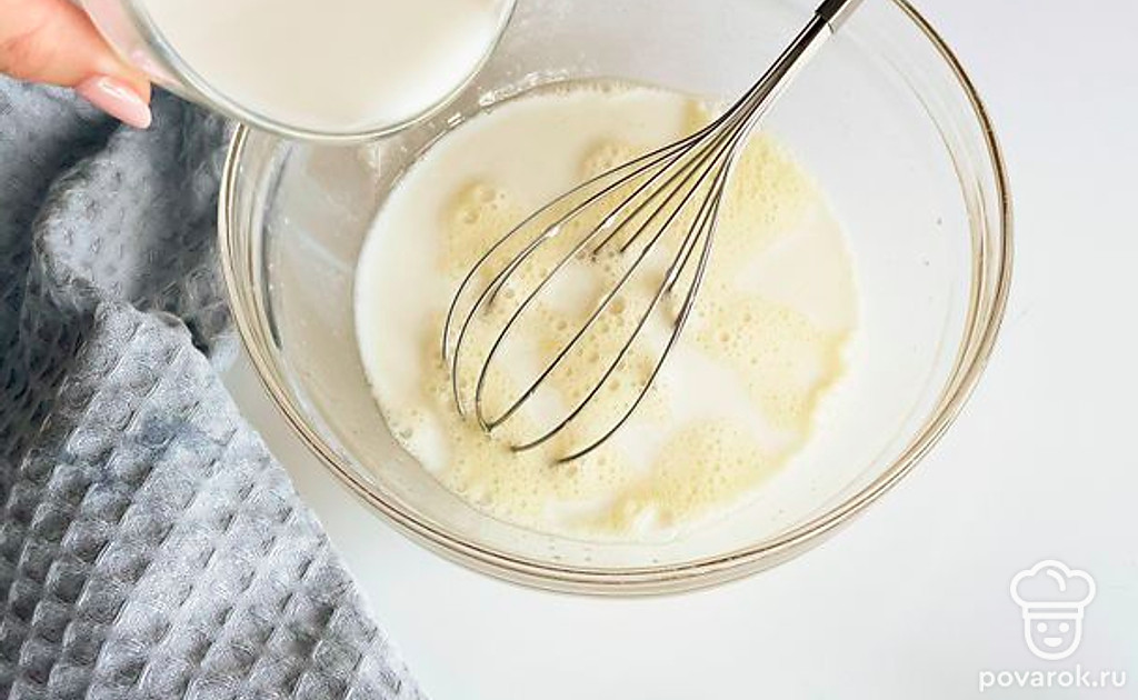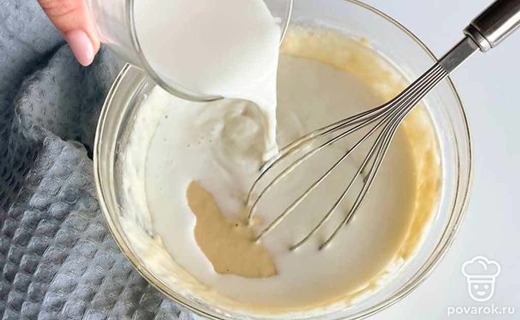 Добавьте небольшую часть молока (100-200 г) и тщательно перемешайте.