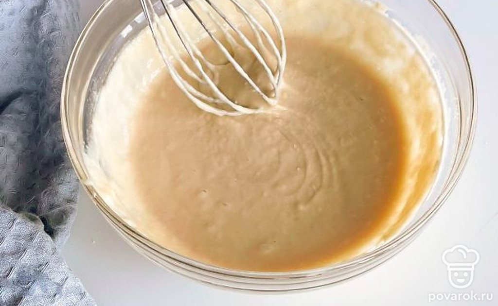 Добавьте муку и хорошо перемешайте тесто, оно получится достаточно густое. Важно следить, чтобы в нем не оставалось комочков.
