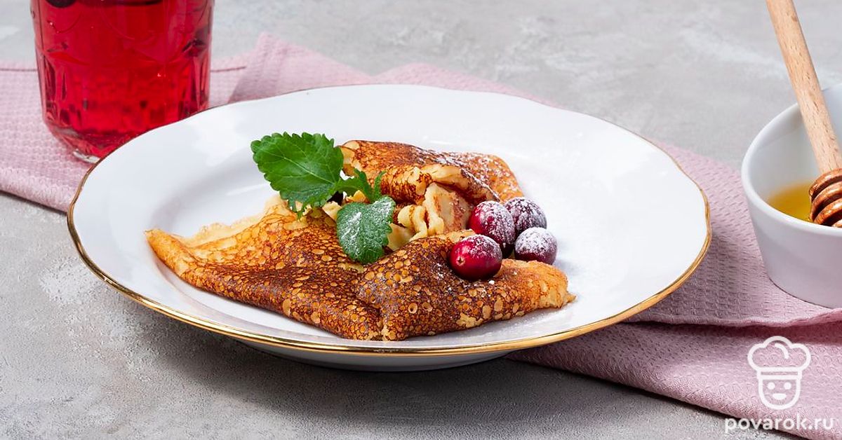 Приготовьте блины. Сковороду смажьте растительным маслом и поставьте на огонь. Выпекайте блины в раскаленной сковороде примерно по 1 минуте с каждой стороны.