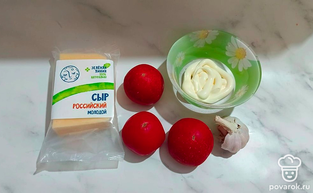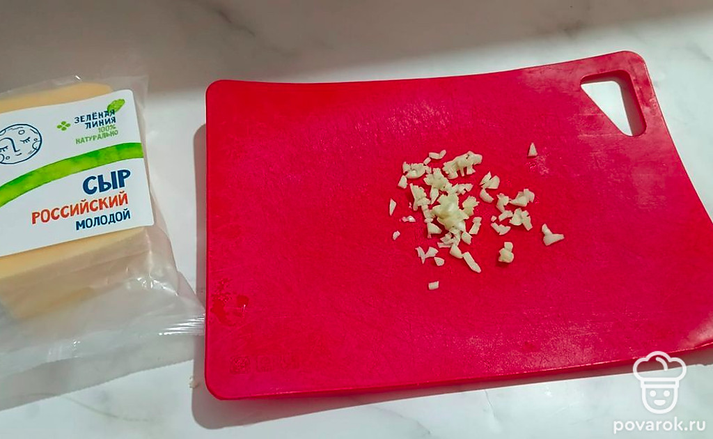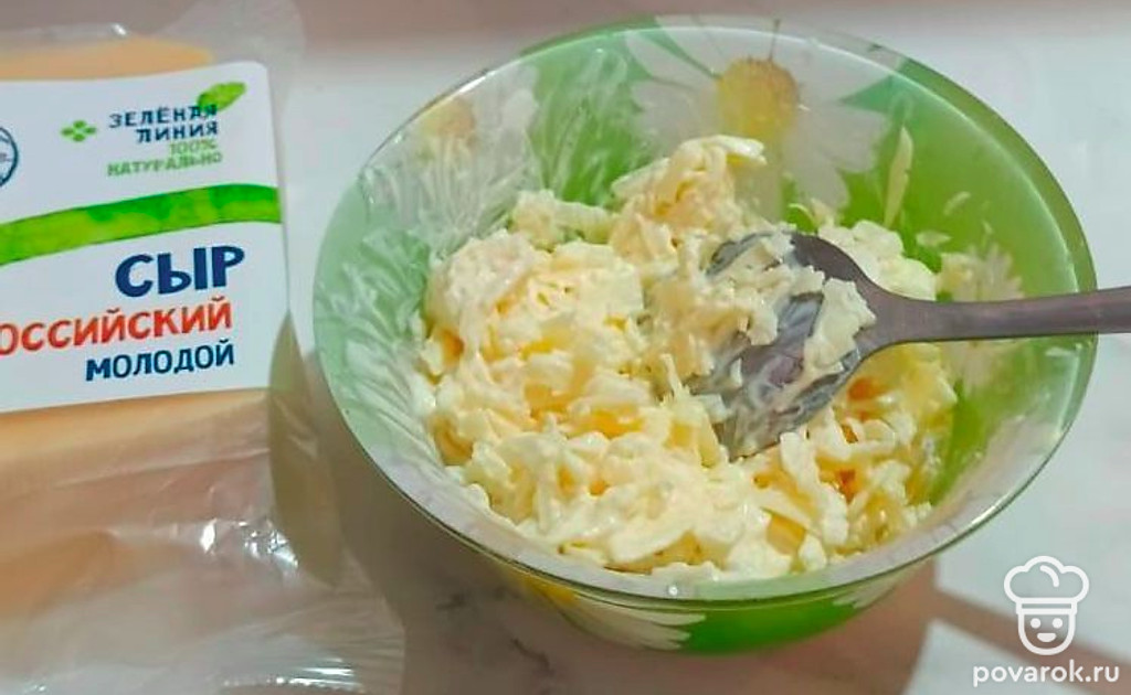 К сыру добавить майонез, чеснок, хорошо перемешать.
