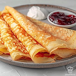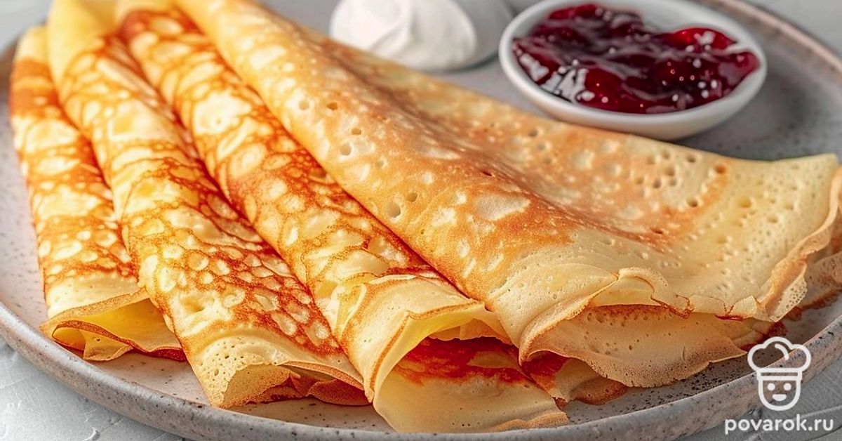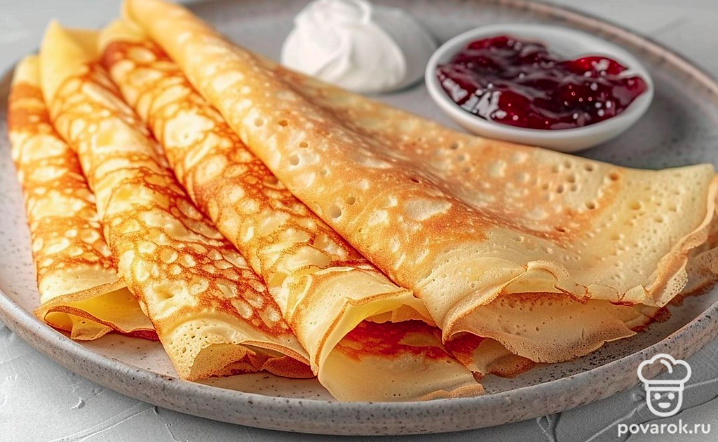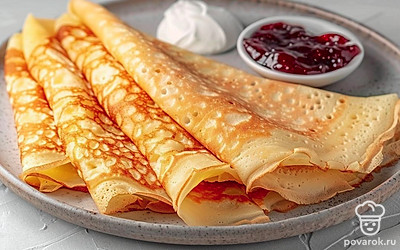 Блины — традиционное блюдо в русской кухне. Их готовили как на праздничный стол, так и в повседневный день и подавали с разными начинками. Эти блинчики приготовлены из бездрожжевого теста, на молоке. Блины получаются нежными, красивого золотистого цвета. Подавайте их с вареньем, сметаной или медом. С вареньем это блюдо приобретет сладкое послевкусие и приятный аромат.