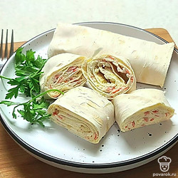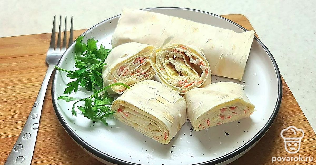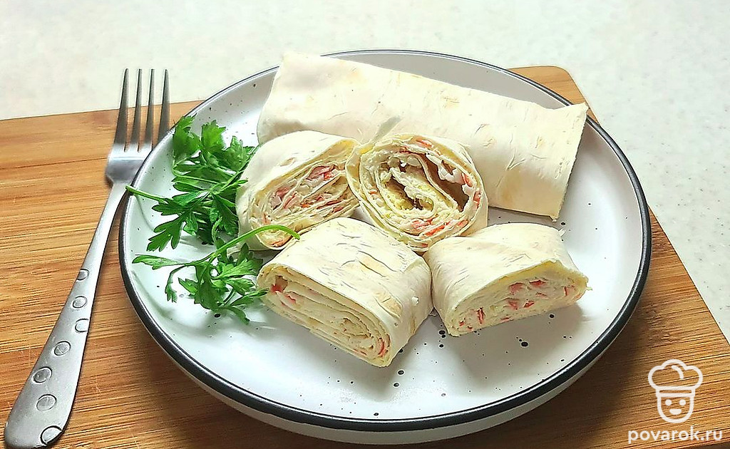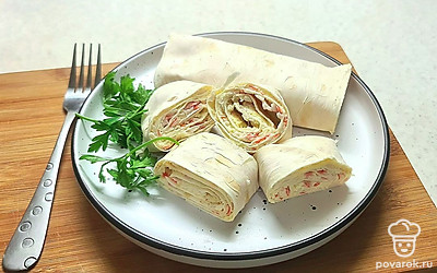 Можно оставить на некоторое время в холодильнике для того, чтобы лаваш лучше пропитался. Разрежьте рулет на порции. Украсьте зеленью.