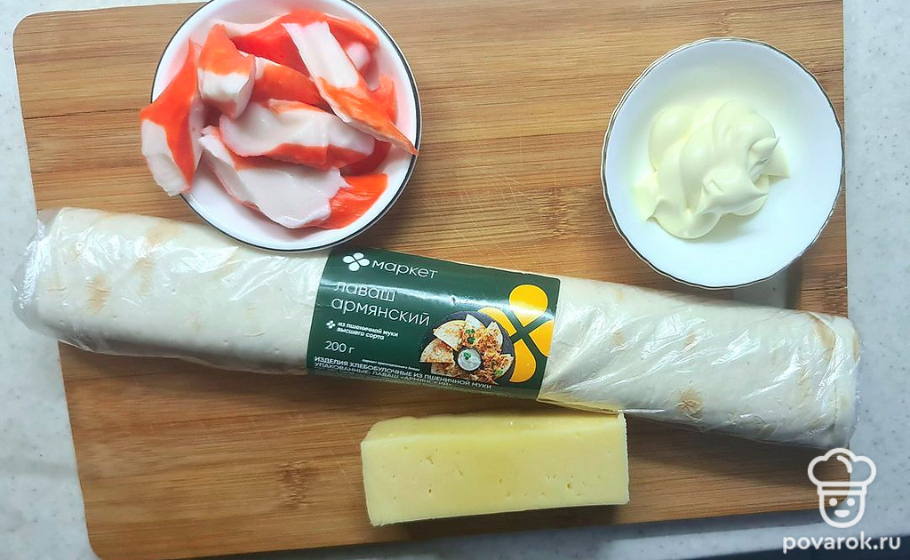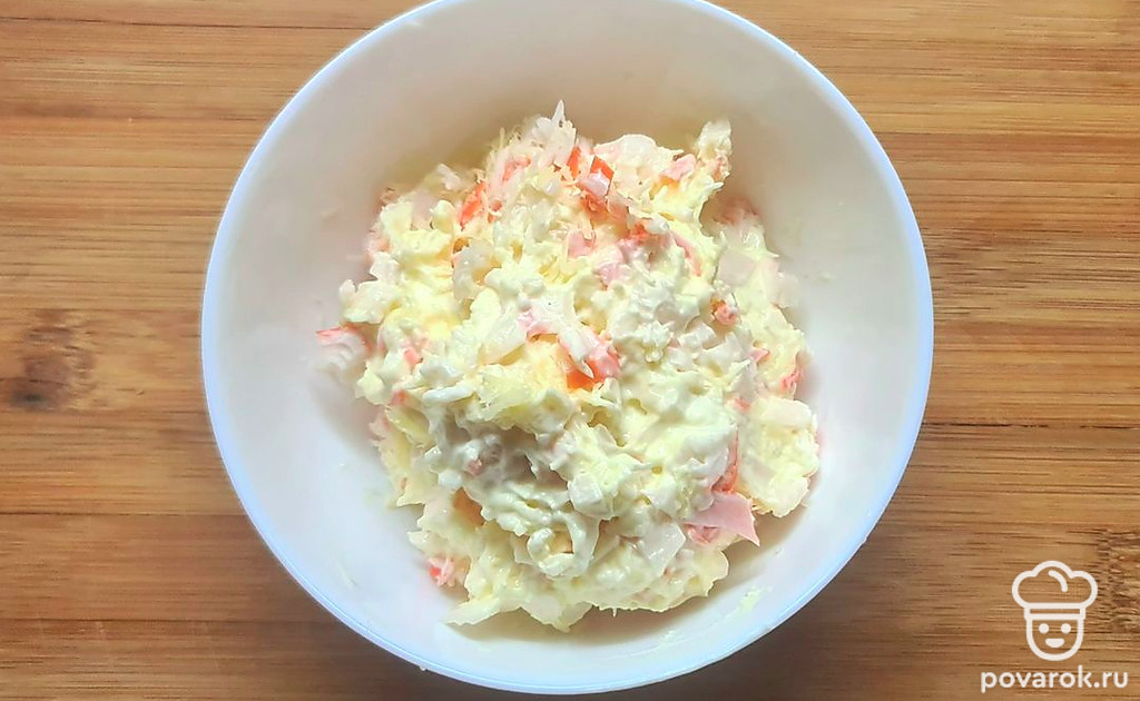 Заправьте майонезом крабовые палочки и сыр. Тщательно перемешайте.