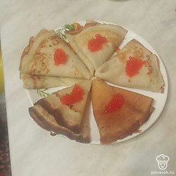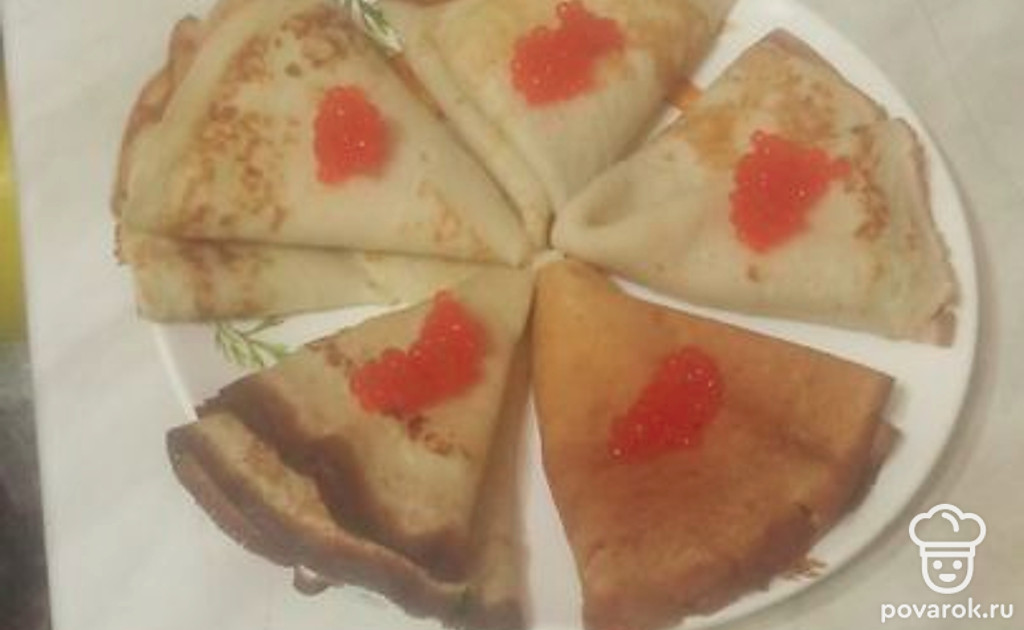 Сложите блинчики треугольниками и подавайте на блюде или подносе. Очень вкусно будет использовать в качестве начинки икру, морепродукты или мясные копчености.