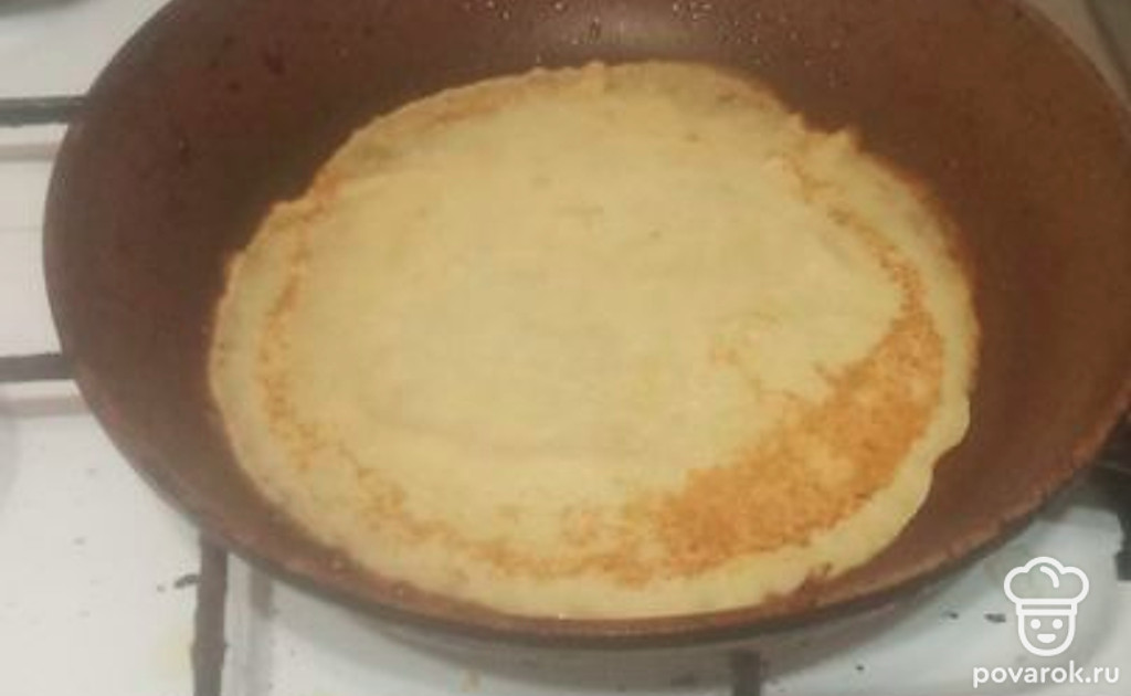 Через 30 секунд с помощью лопатки переверните блинчик и жарьте с другой стороны около 40 секунд.