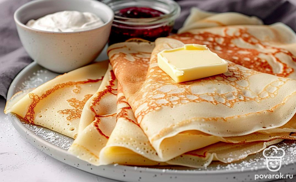 Подавайте блюдо со сметаной, маслом, джемом и вареньем.