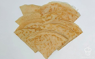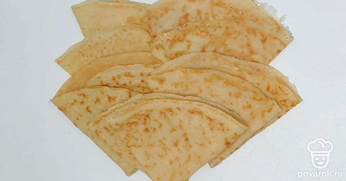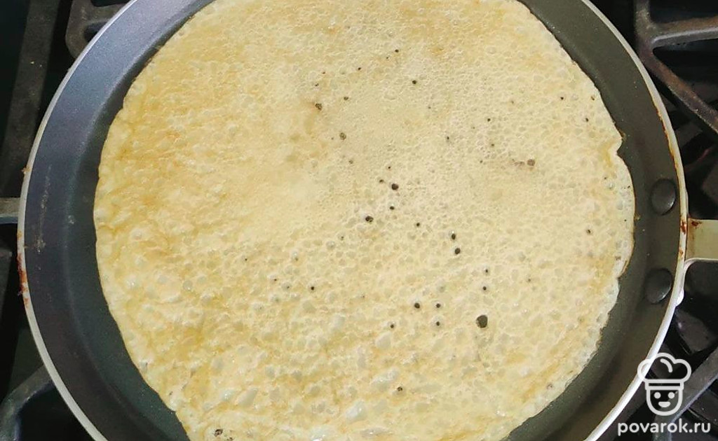На разогретую сковороду налейте тоненький слой теста. Обжаривайте блин с обеих сторон до золотистого цвета.