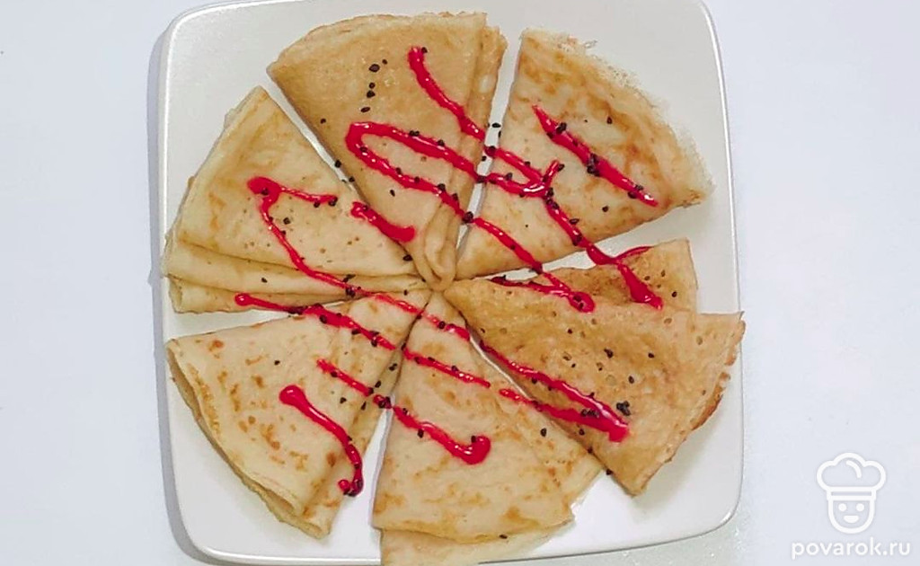 Блинчики, приготовленные по этому рецепту, получаются пышными и вкусными. Такое блюдо отлично подойдет на завтрак, а также в качестве легкого перекуса, который можно взять с собой.С указанным в рецепте количеством сахара блинчики получаются уже достаточно сладкими, но вы можете регулировать степень сладости на свой вкус, уменьшив или добавив сахара при замесе теста.