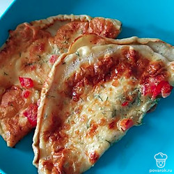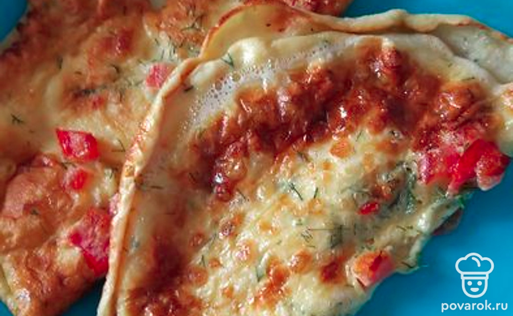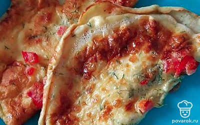 На разогретую сковороду, смазанную маслом, половником наливайте смесь. Обжарьте с одной стороны, переверните. На одну половину насыпьте сыр, немного поджарьте и накройте другой половинкой.