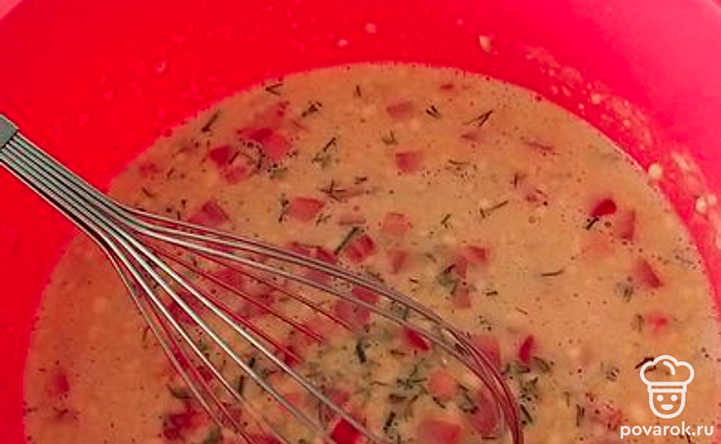 Разбейте яйца, добавьте соль и молоко. Взбивая, постепенно добавляйте муку. Хорошо все смешайте до однородной массы, затем добавьте зелень и помидор.